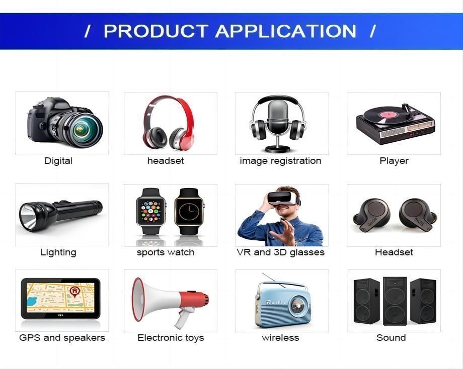 Bateria litowo-polimerowa 3,7 V 2000 mAh 103450 jest szeroko stosowana w głośnikach Bluetooth, przenośnych wzmacniaczach, radiach, zestawach słuchawkowych Bluetooth, aparatach cyfrowych, maszynach edukacyjnych, power bankach, kijach do selfie, mini reflektorach przeciwwybuchowych, latarkach o dużej intensywności, światłach awaryjnych, lampach montowanych na głowie, mobilnych terminalach POS, słownikach elektronicznych, przenośnych konsolach do gier itp.
